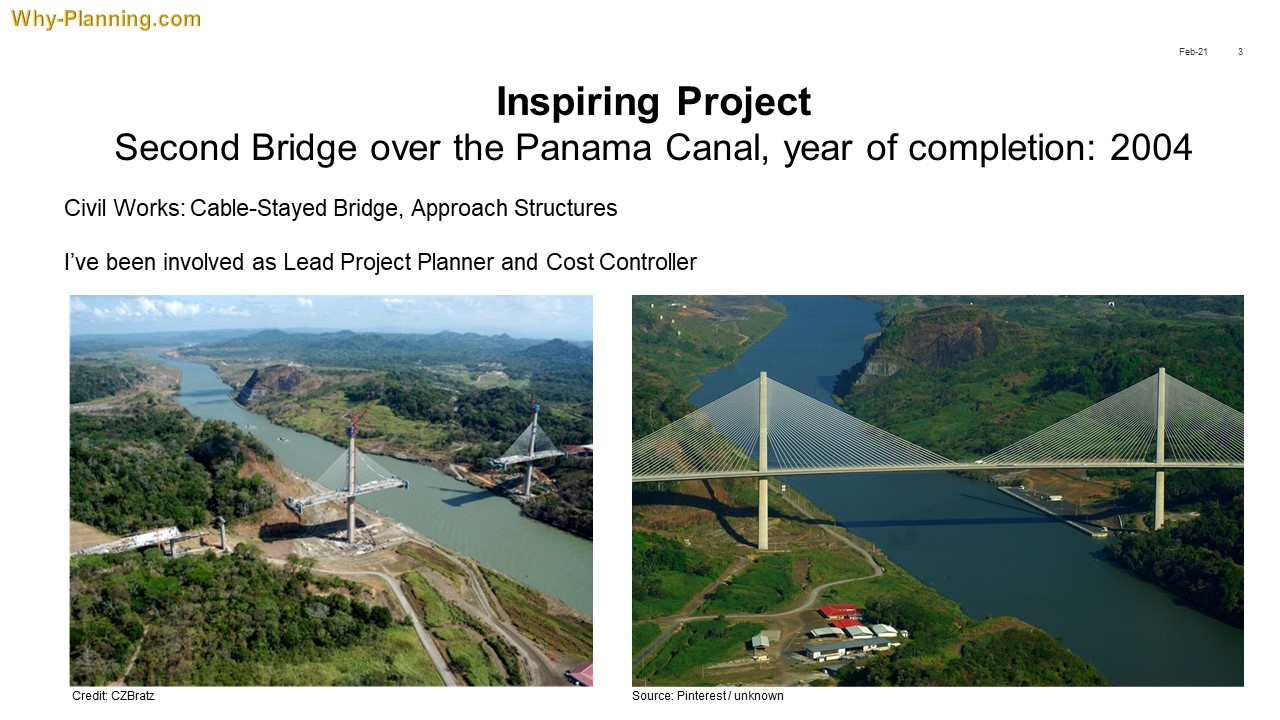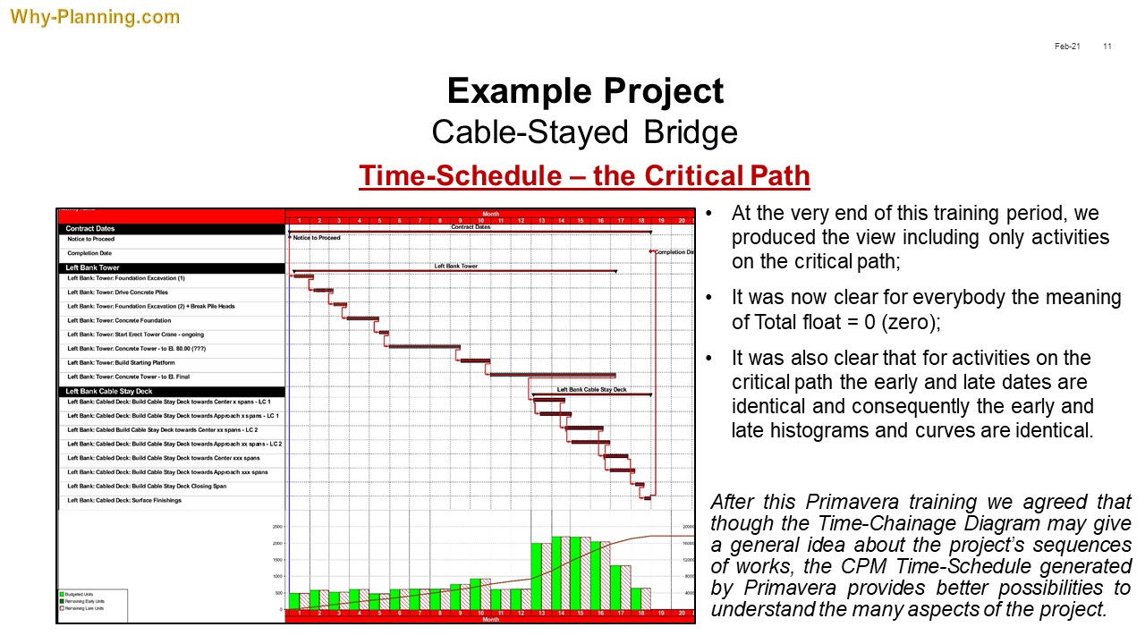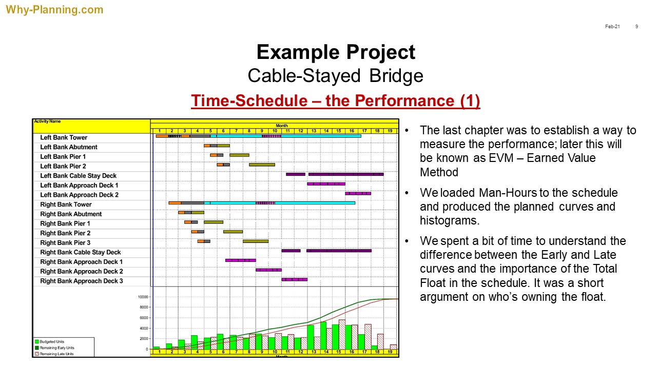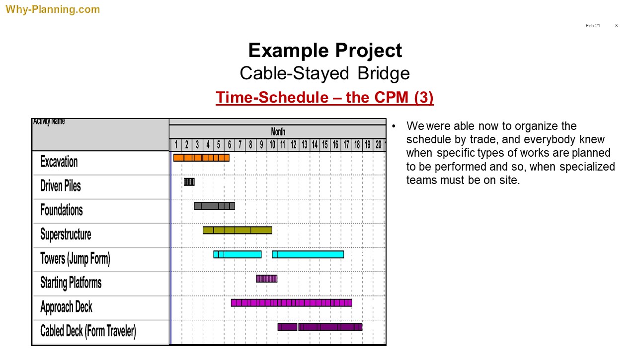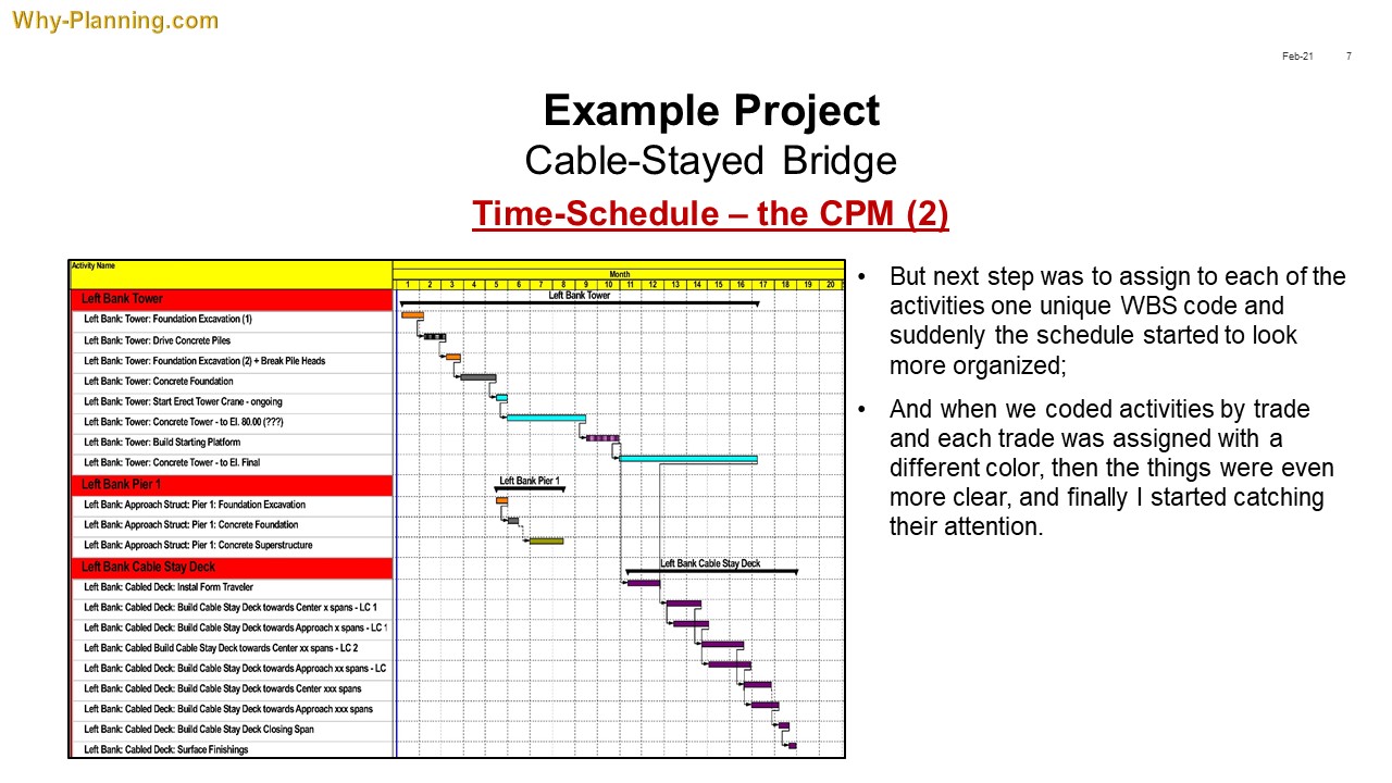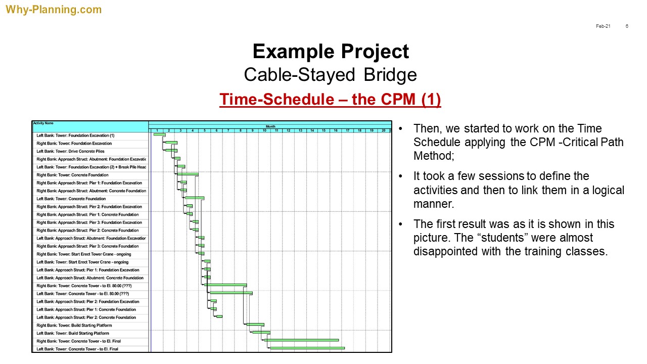 The planner is responsible to produce a time-schedule that reflects exactly the way the project has to be be build. Moreover, the planner is responsible to create a time-schedule easy to understand by all stakeholders and easy to convey information to all involved parties. The planner is responsible to design the model of the project. All is described in the presentation below. I choose as an example a Cable Stayed Bridge project, inspired by the Centennial Bridge over the Panama Canal in Panama.